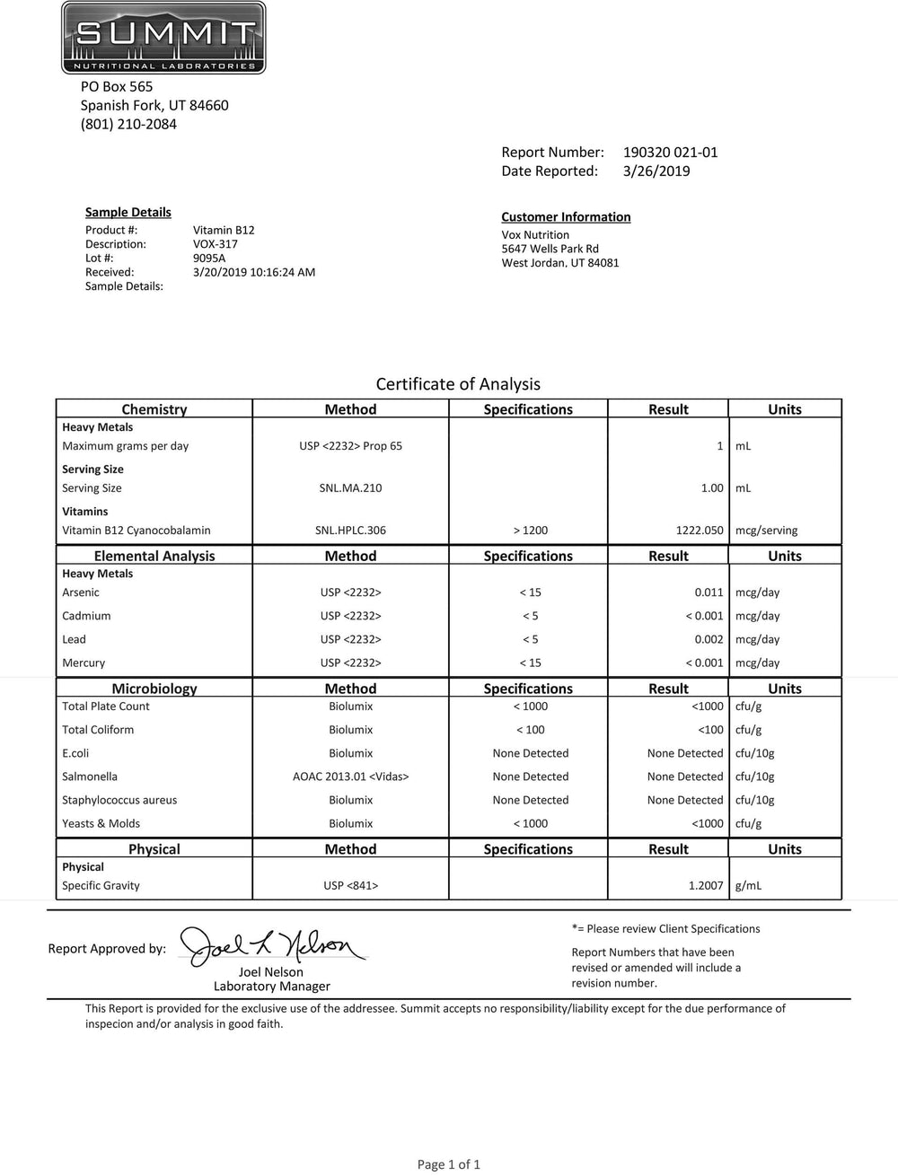 B-12 drops is formulated to support increased energy, cardiovascular health, energy metabolism, digestive health, antioxidant support, immune health, and cognitive function. Our product is synthesized utilizing the latest scientific research and formulated with high quality ingredients. Our formula is third party independently tested for heavy metals, impurities, made in the USA, GMP certified, and produced in an FDA registered facility. 1% of the supplements on the market can match our world class standards. |