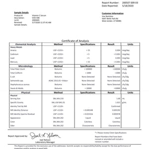 Vitamin C serum is formulated to boost skin and immune health in a luxurious serum filled with antioxidants. Our world-class Vitamin C serum supports skin elasticity, collagen production, and reduced wrinkles. Our product is synthesized utilizing the latest scientific research and formulated with optimal ratios of collagen peptides to produce world-class results. Our formula is third-party independently tested for heavy metals, impurities, made in the USA, GMP certified, and produced in an FDA registered facility. 1% of the supplements on the market can match our world-class standards. |